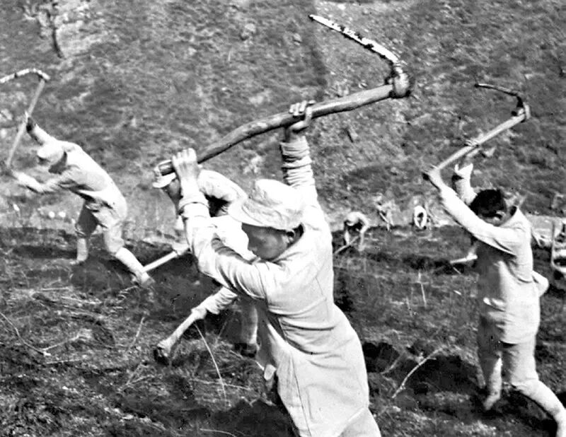 1941年前后,由于日本帝国主义的“扫荡”和国民党反动派的封锁包围及自然灾害,各抗日根据地出现了极端困难的局面。中国共产党提出“发展经济,保障供给”的方针,开展了大生产运动。图为晋察冀边区的八路军指战员在开荒生产。新华社发