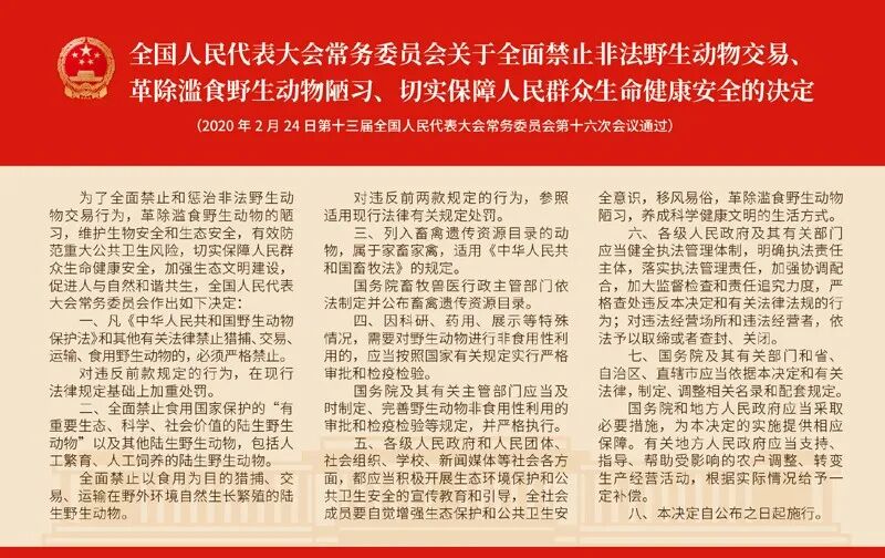 关于修法,习近平总书记明确要求,要认真评估传染病防治法、野生动物保护法等法律法规的修改完善。早在2月3日召开的中央政治局常委会会议上,总书记就鲜明指出,食用野生动物风险很大,对公共卫生安全构成了重大隐患,“再也不能无动于衷了!”在这篇重要文章中,他进一步指出,“引发这次疫情的病毒,包括此前的非典、高致病性禽流感等疫情的病毒,多数病原体来自野生动物或与之有关”。要尽快梳理有关法律规定,统筹做好修改、衔接、完善工作,更好保障人民生命健康安全。