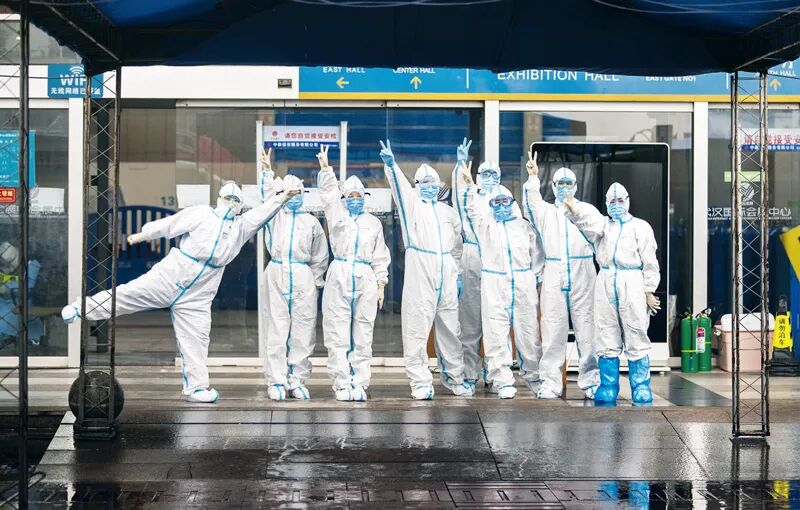 2020年3月10日,随着武昌方舱医院的医护人员送走最后一批康复出院的新冠肺炎轻症患者,武汉市方舱医院全部完成使命,宣布休舱。图为江汉方舱医院的医疗队员出舱后合影。新华社记者 费茂华/摄