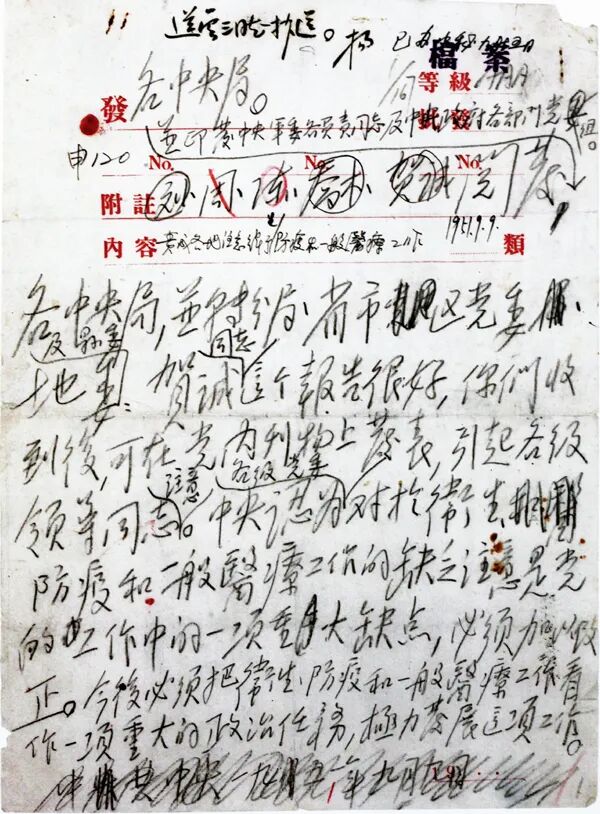 1951年9月7日,卫生部党组书记、副部长贺诚在给中央关于全国防疫工作的报告中,总结了新中国成立以来卫生工作遵循“面向工农兵、预防为主、团结中西医”三项原则取得的成绩和工作中还存在的缺点。报告得到毛泽东同志的高度重视,他在以中央名义起草的指示中明确提出:“今后必须把卫生、防疫和一般医疗工作看作一项重大的政治任务,极力发展这项工作。”图为指示原件。
