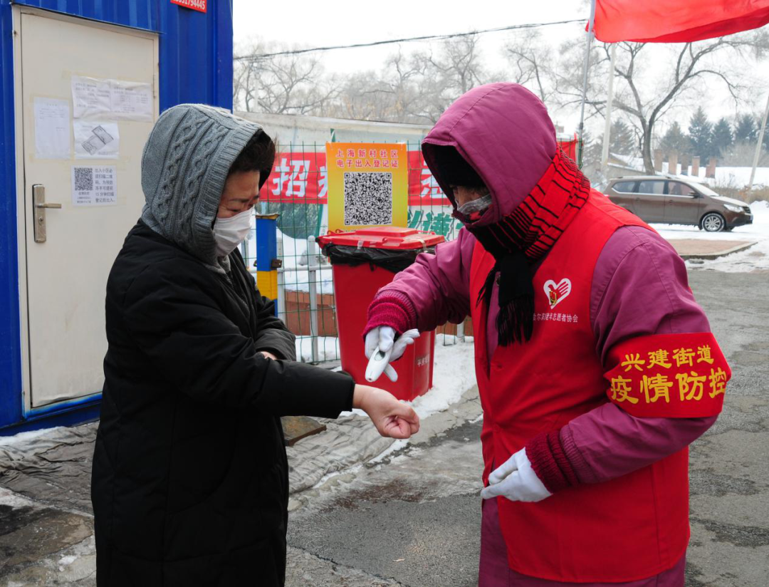 2020年3月3日,黄玉芹(右)在哈尔滨市上海新村社区给进入小区的居民测体温。 新华社记者 强勇/摄70岁的于庆河和69岁的妻子黄玉芹是两名老党员,两人的党龄之和超过80年。