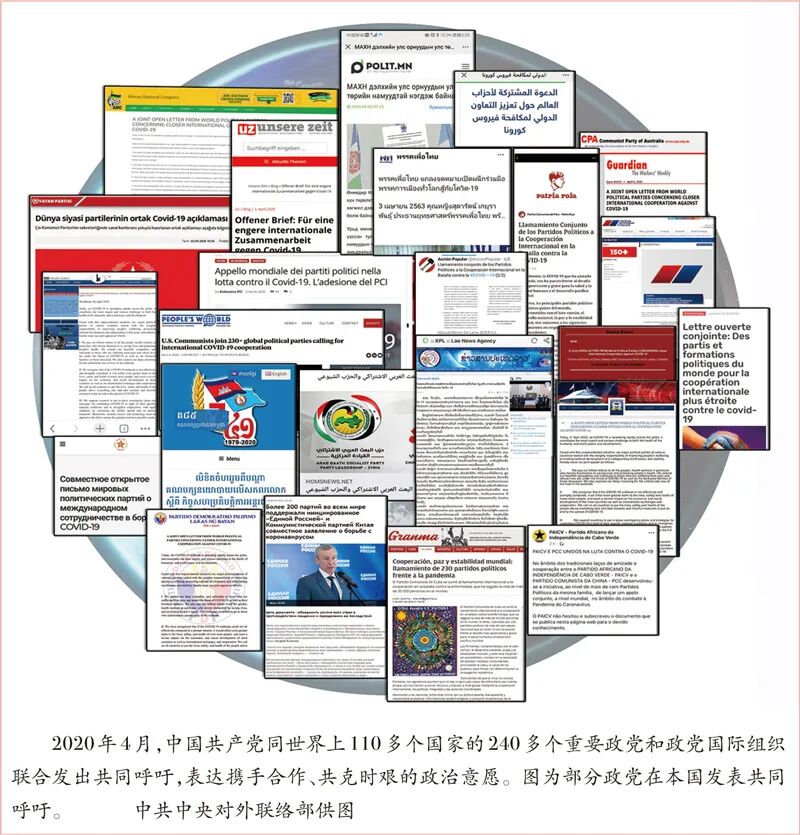 推动世界政党发出共同呼吁。习近平总书记指出,“重大传染性疾病是全人类的敌人”,“新冠肺炎疫情再次表明,人类是一个休戚与共的命运共同体”。我们党依托国际政党交流合作网络,引领各方深刻认识到,面对新冠肺炎疫情全球蔓延,任何国家都无法独善其身,只有携手合作才能打赢这场战役。习近平总书记亲自与老挝人民革命党中央总书记、国家主席本扬等多国元首和政党领导人通电话,强调“病毒没有国界,不分种族,国际社会只有形成合力,才能战而胜之”。在我们党积极推动下,世界上110多个国家的240多个重要政党和政党国际组织联合发出共同呼吁,指出新冠肺炎疫情对人类卫生健康及世界和平发展构成最紧迫和最严峻的挑战,各国应增强人类命运共同体意识,加强国际合作,相互支持和帮助,汇集全球的资源和力量,坚决打败病毒这一人类的共同敌人,坚决反对将公共卫生问题政治化,呼吁各国把人民生命安全和身体健康放在第一位,并采取积极措施保护外国侨民、留学生的健康安全和合法权益。这是新冠肺炎疫情暴发以来世界主要政党首次就国际抗疫合作发出共同声音,成为世界政党交往史上一件大事。与此同时,推动亚洲政党国际会议和二十国集团民间社会会议发表呼吁加强国际抗疫合作的共同倡议和声明,表达了各方携手合作、共克时艰的政治愿望,产生了良好的政治效果。