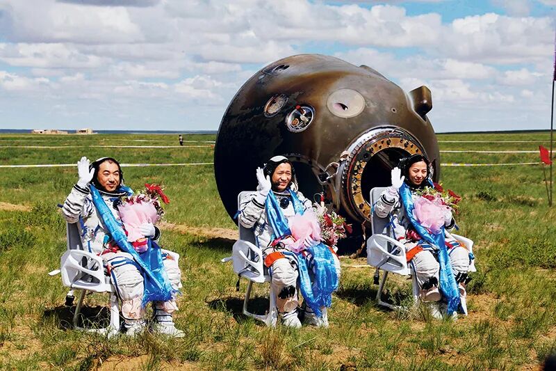2013年6月26日8时7分,遨游太空15天的神舟十号飞船,在顺利完成我国天地往返运输系统的首次应用性飞行后,其返回舱成功降落在内蒙古中部阿木古朗草原。图为圆满完成任务的三位航天员张晓光、聂海胜、王亚平(从左至右)自主出舱后挥手致意。新华社记者 王建民/摄