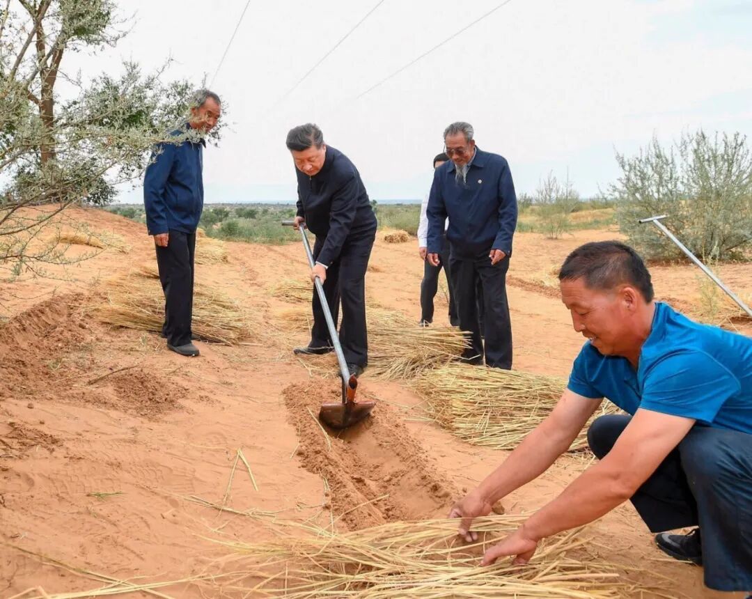 左边这张照片的故事发生在甘肃。2019年8月21日,正在甘肃考察的习近平总书记来到古浪县八步沙林场。考察中,他拿起一把开沟犁,参与到治沙劳动中。旁边的村民问:“总书记的体力还好啊?”总书记说:“这点体力还得有!”