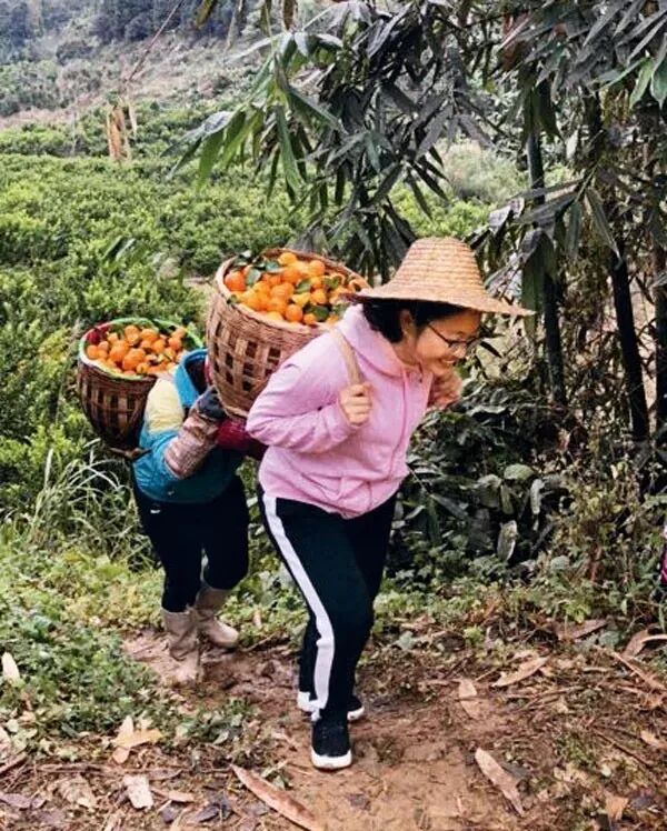黄文秀带领村干部和群众挖掘百坭村的资源优势,学经验、找路子,发展了杉木、八角、砂糖桔、枇杷等特色种植产业,拓宽了群众增收渠道。图为黄文秀帮着村民背送丰收的砂糖桔。 百色市委宣传部供图