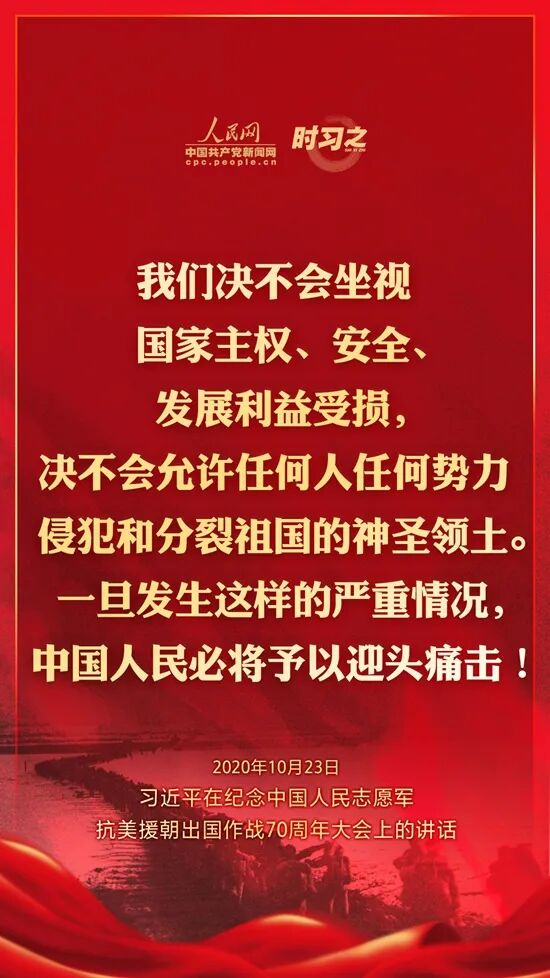我们决不会坐视国家主权、安全、发展利益受损,决不会允许任何人任何势力侵犯和分裂祖国的神圣领土。一旦发生这样的严重情况,中国人民必将予以迎头痛击!