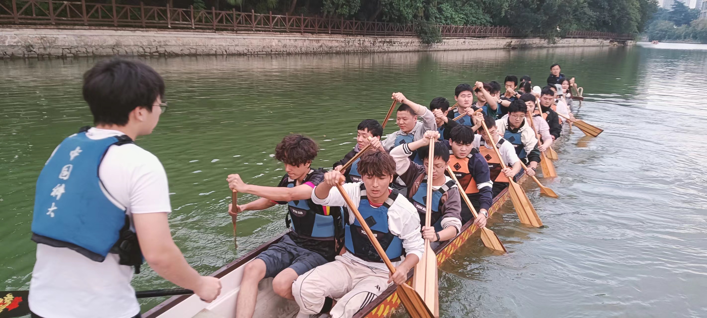 在完成充分的热身运动后,教练对每位同学的救生衣穿戴情况进行了细致检查,确保安全无虞。接下来进入龙舟文化实践环节。教练在活动开始前多次强调划龙舟的注意事项与竞技要点,要求全体同学听从指挥、密切配合,确保船体平稳。在校龙舟队专业队员的带领下,同学们齐心协力,顺利完成两公里的龙舟划行体验。大家在挥桨前行中,切身感受到龙舟运动所蕴含的团结协作、奋勇争先的精神,也体会到中华传统体育文化的深厚魅力。