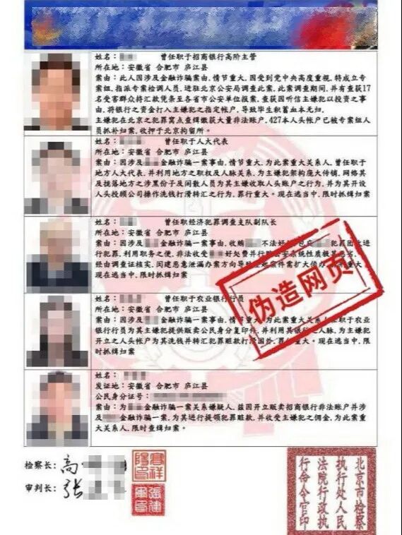 假冒的“警官”称受害人的身份可能被冒用于犯罪,并发送伪造的附有受害人头像照片的“通缉令”等法律文书,以缴纳保证金或查验资金流水用于加速查清事实为由,要求受害人转账至指定诈骗账户。