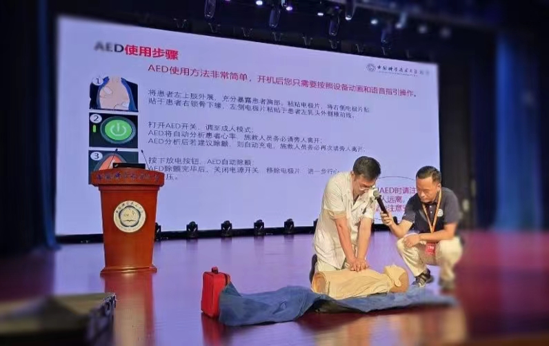 随后,校医院医务人员刘晨晖以理论结合实操的方式,重点讲解了心脏骤停“黄金四分钟”救援理念,并与同事安俊丽共同细致演示了心肺复苏(CPR)全流程,包括环境安全确认、患者评估、胸外按压、人工呼吸及AED使用等关键环节。